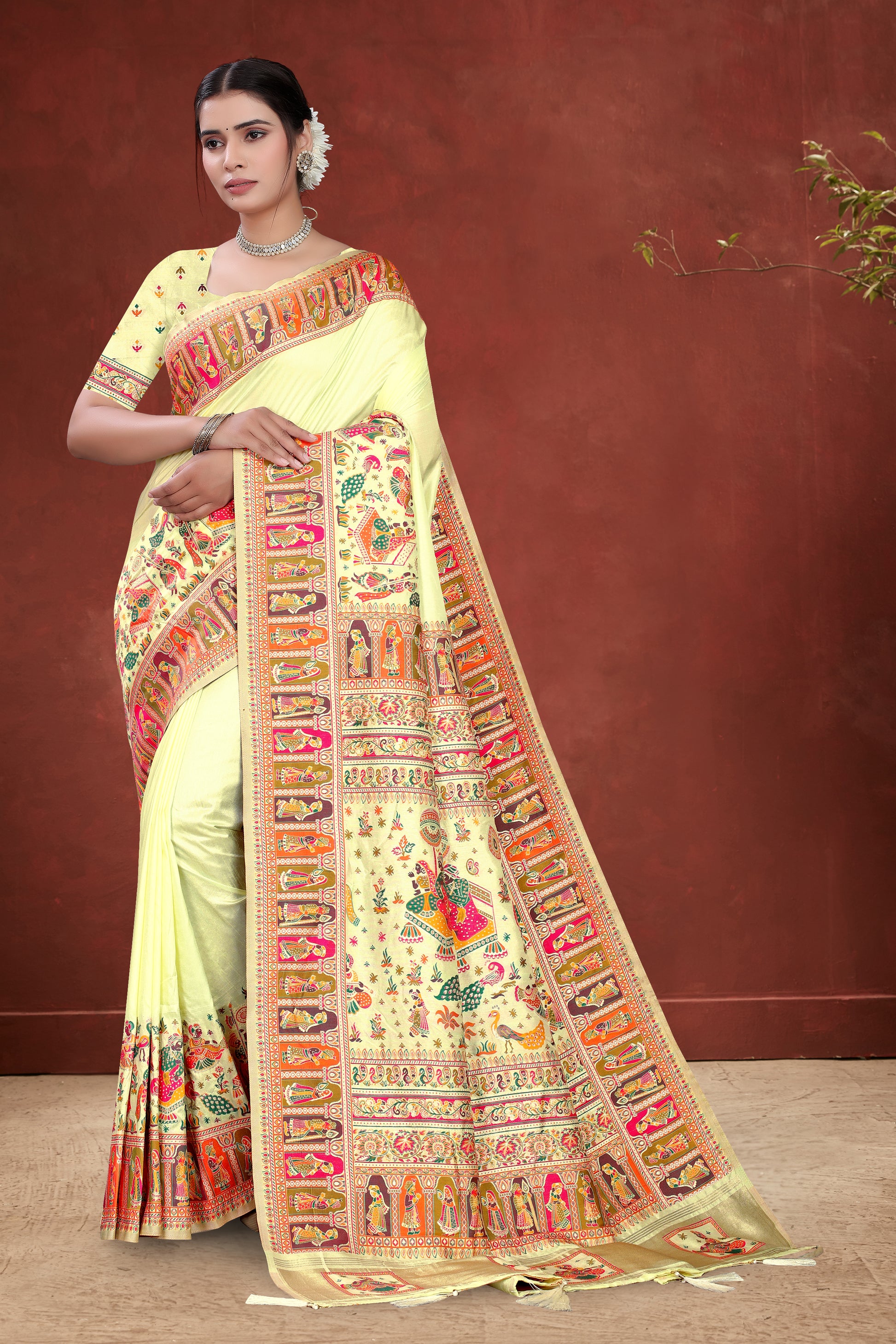 Step into the spotlight with this Cream coloured Banarasi saree that blends timeless heritage with vibrant Gujarati-style artistry. Crafted from soft and flowy pamina silk, the saree features intricate floral vines and peacock-inspired motifs woven across the drape. The true showstopper is the stunning multicolour pallu, adorned with a Patola-style patchwork look — combining shades of orange, red, green, and gold in a beautifully arranged tapestry of geometric and folk designs. The zari-woven border completes the saree with a festive, regal finish, perfect for weddings, functions, and traditional celebrations.