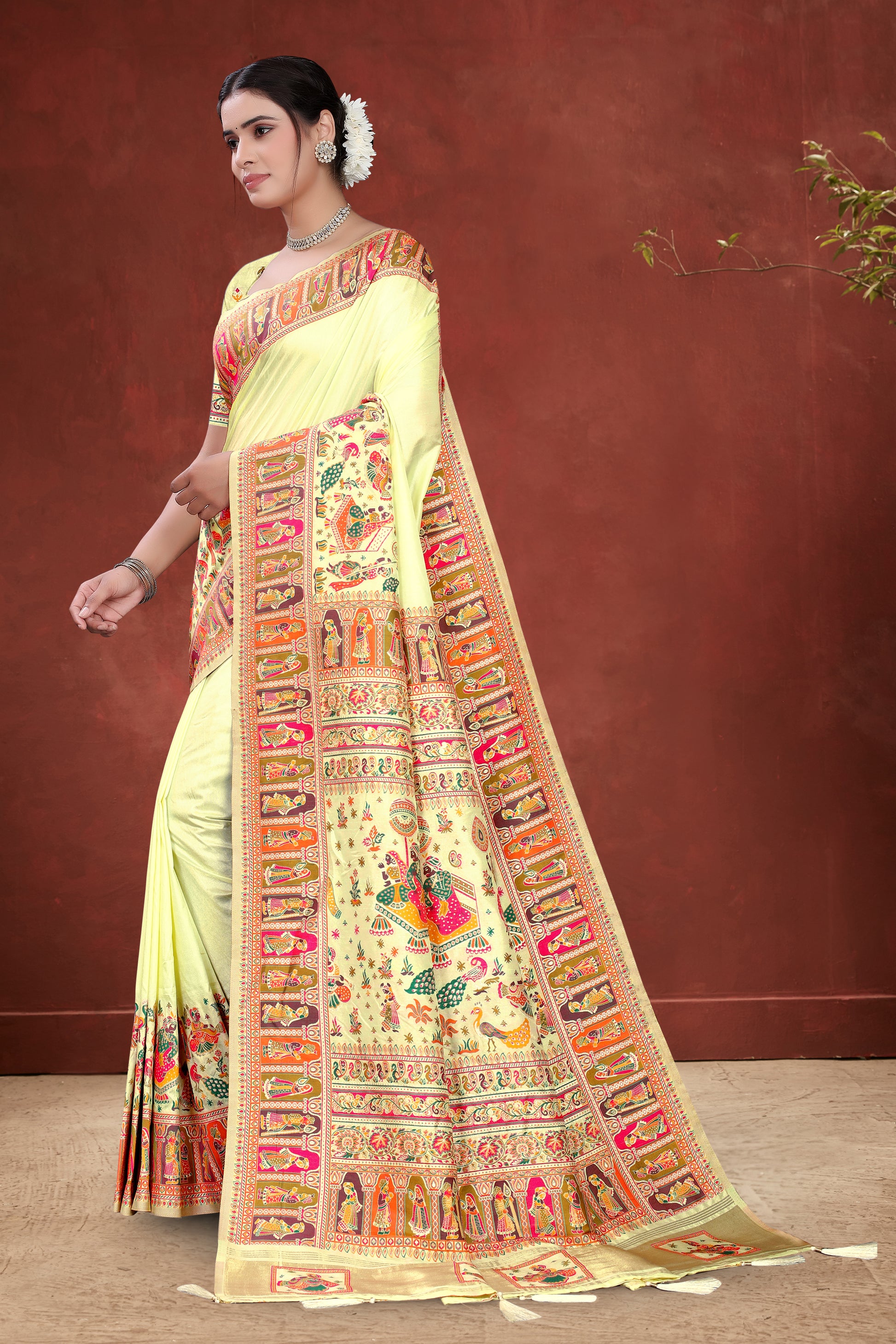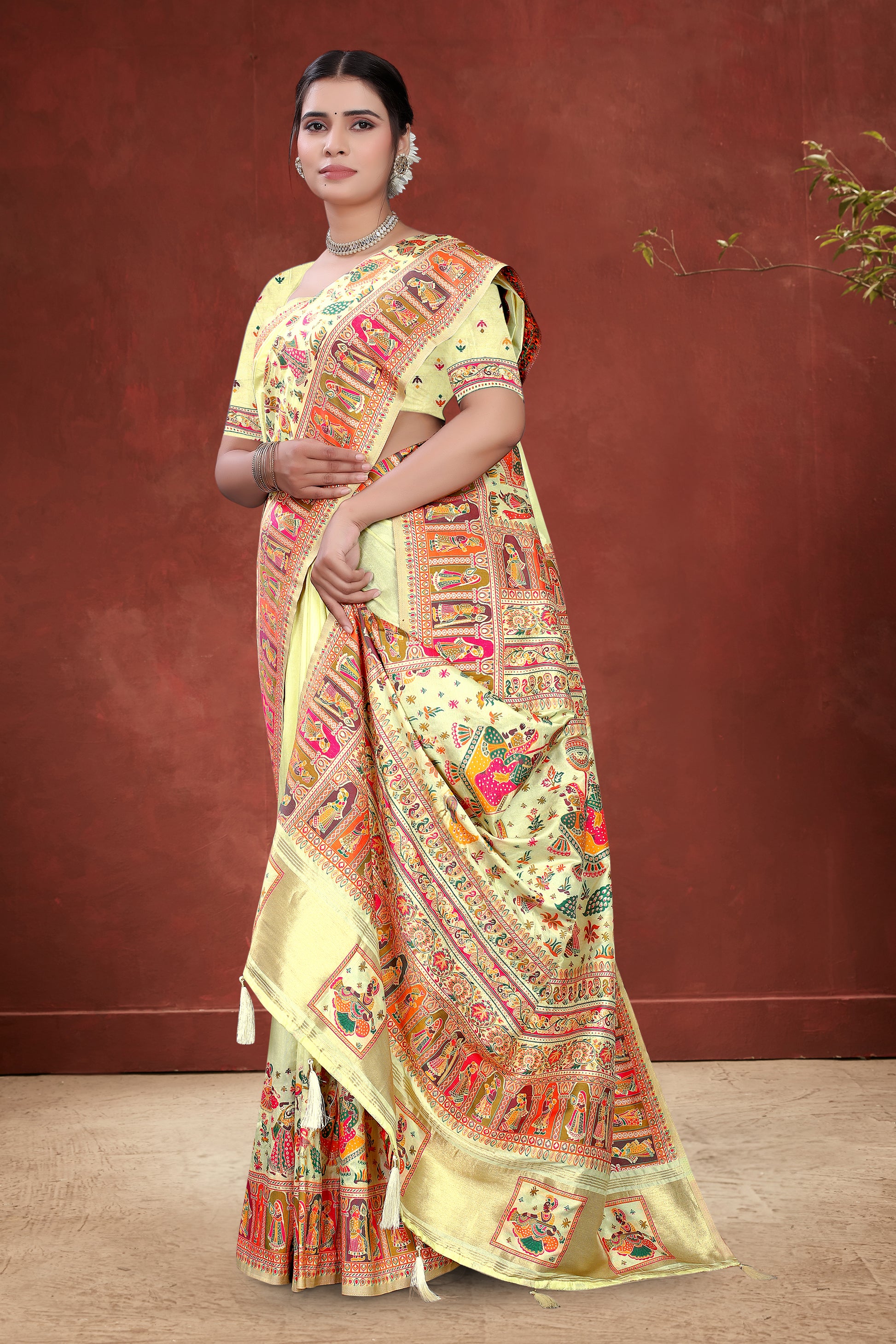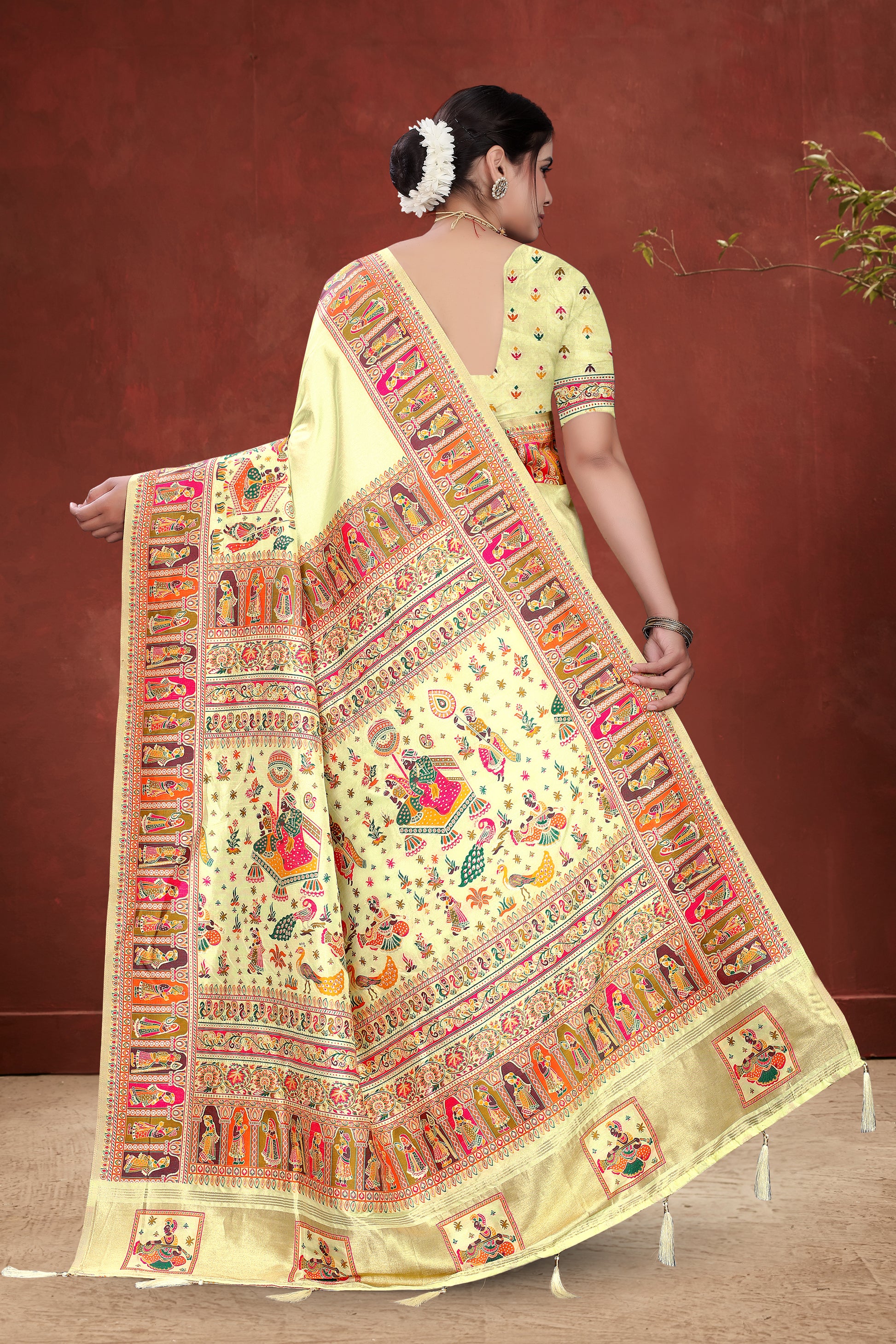 Heritage Draped – Cream Silk Saree with Royal Court Illustrations
