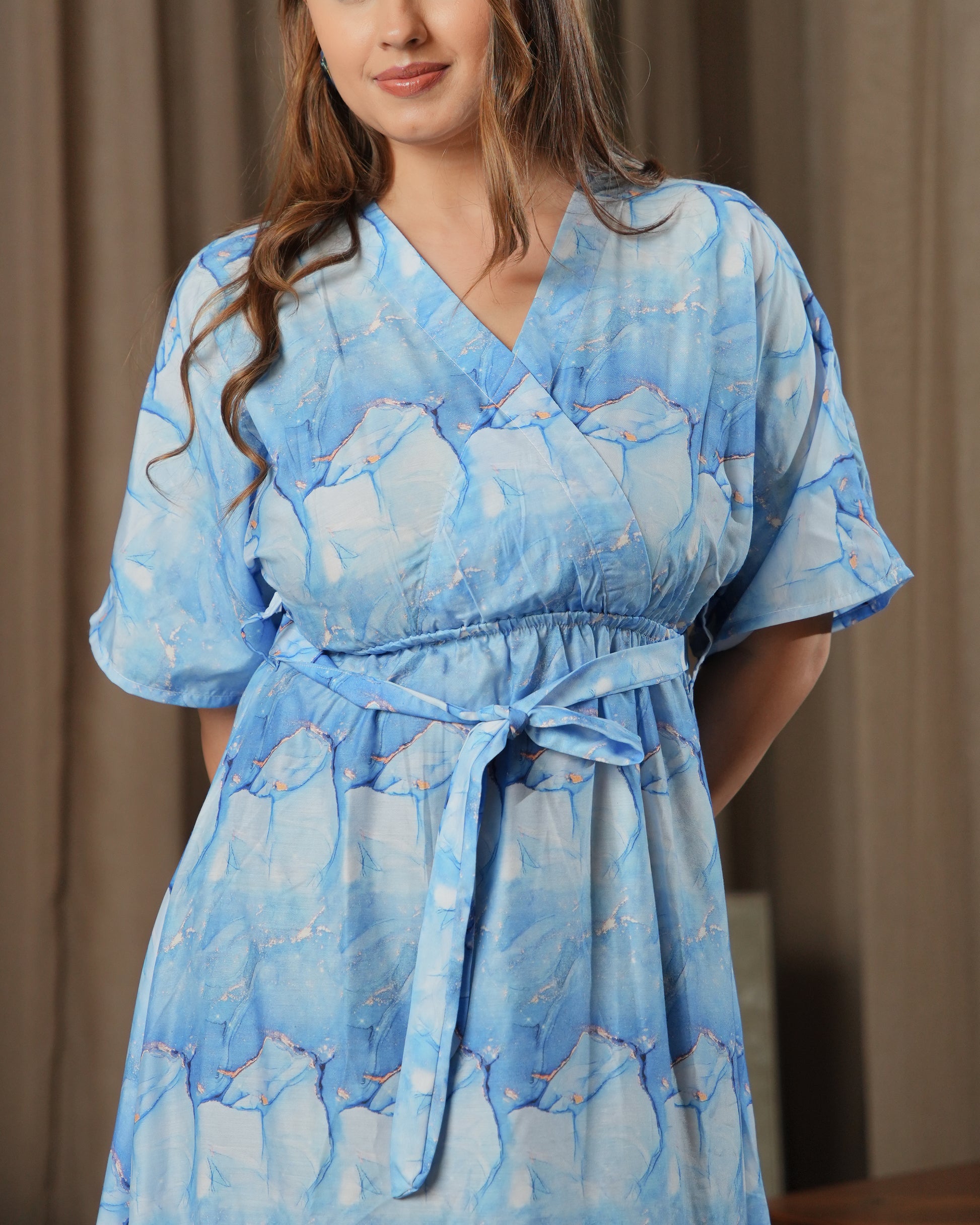 Elevate your style with this airy midi dress, crafted from soft, lightweight muslin fabric for ultimate comfort and drape. It features a striking sky blue and white abstract/marble print that adds a vibrant, contemporary look. The dress is designed with a flattering V-neckline, relaxed short dolman sleeves, and an elasticized waist with a matching fabric tie to define the figure. Finished with a flowy, tiered hem, this piece is a beautiful choice for summer events or chic everyday wear