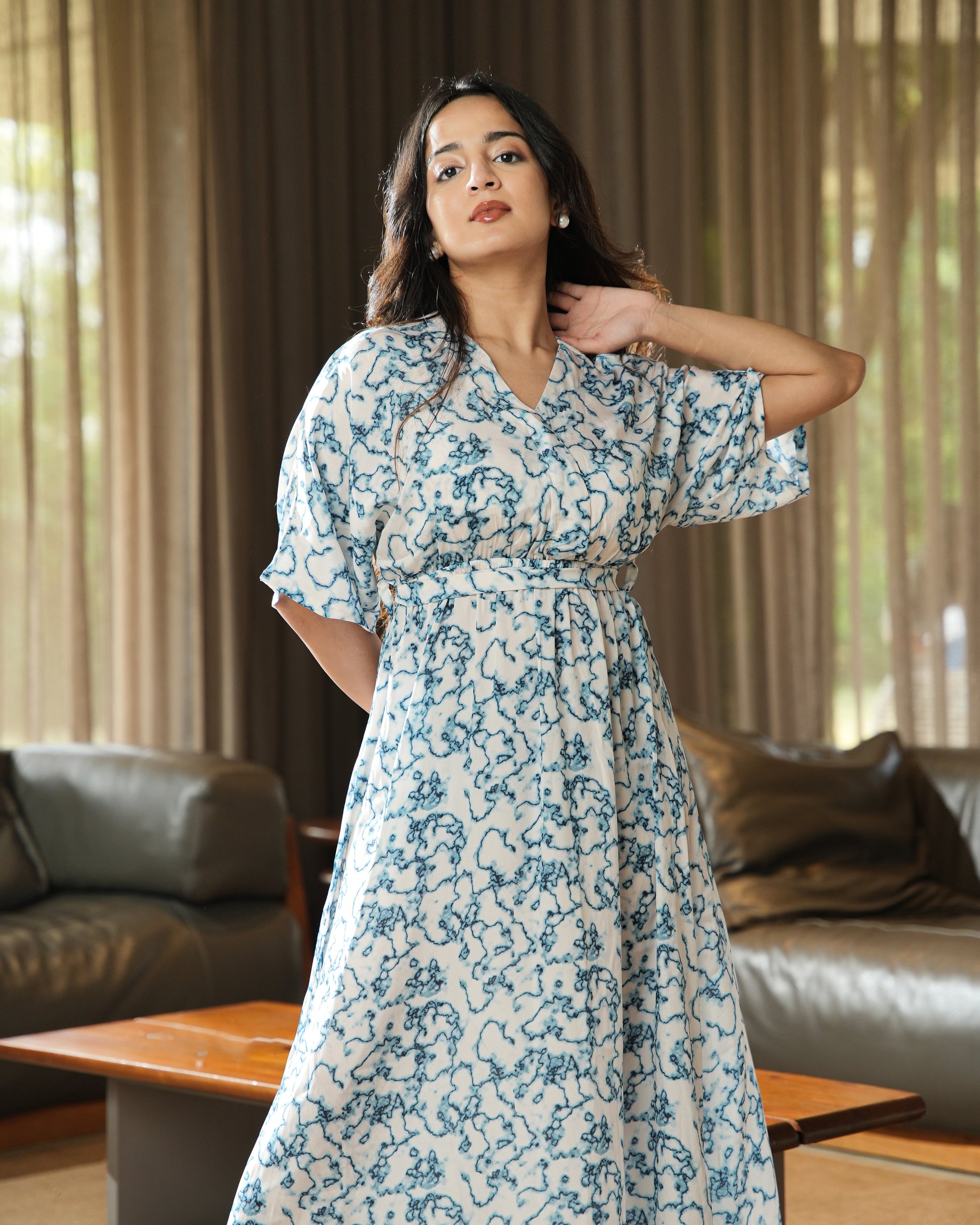 This elegant midi dress is crafted from lightweight and fluid crepe fabric, perfect for a refined drape. It features a striking blue and white marble/abstract print throughout. The dress is designed with a flattering V-neckline, comfortable short dolman sleeves, and an elasticated waist to gently define the silhouette. This sophisticated piece is ideal for both dressed-up day events and stylish everyday wear.