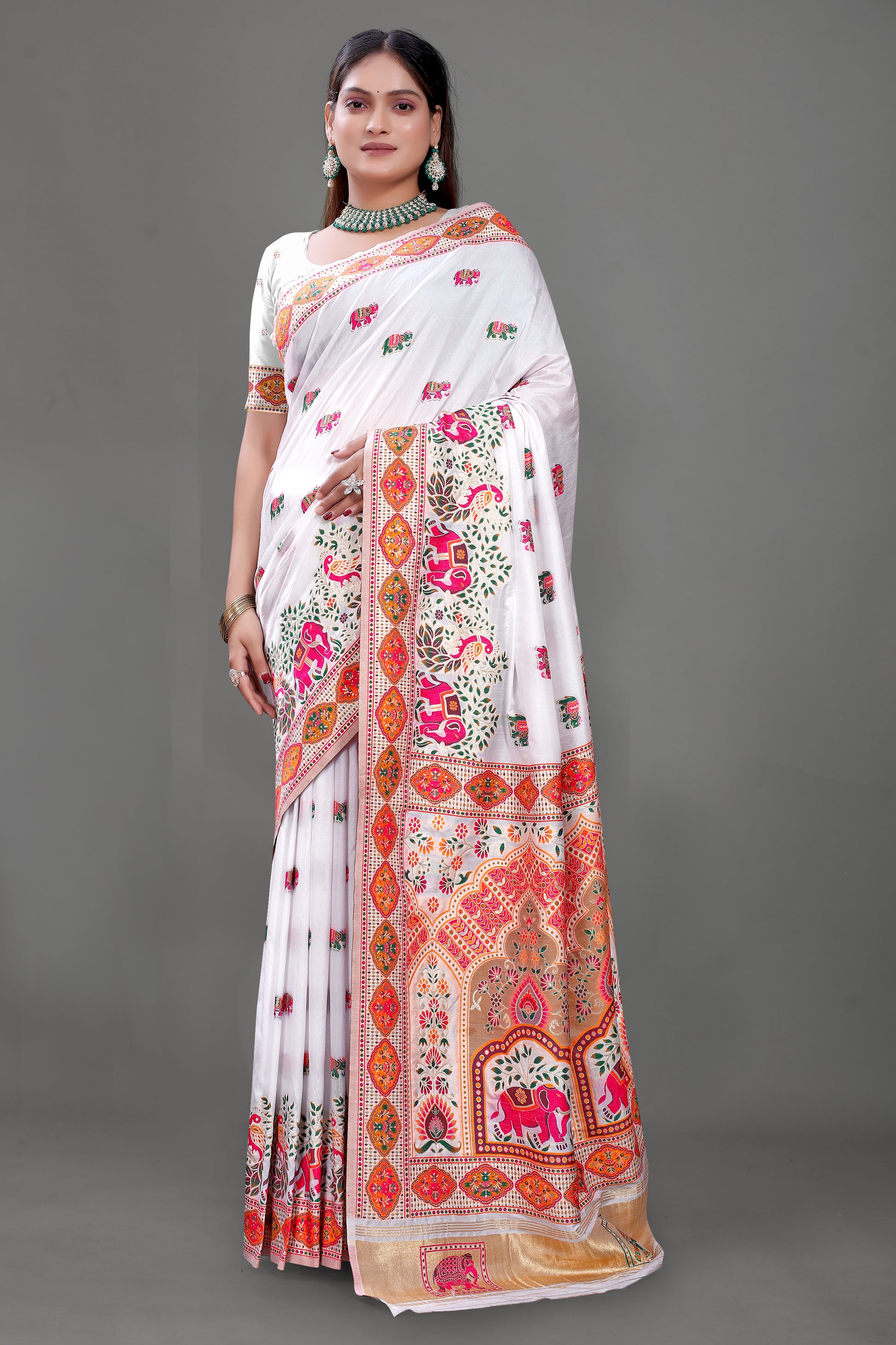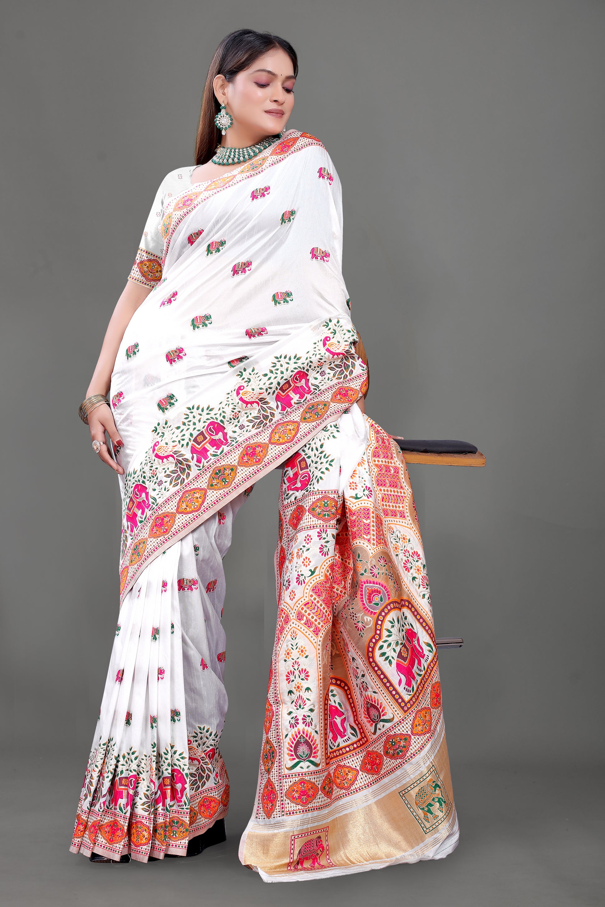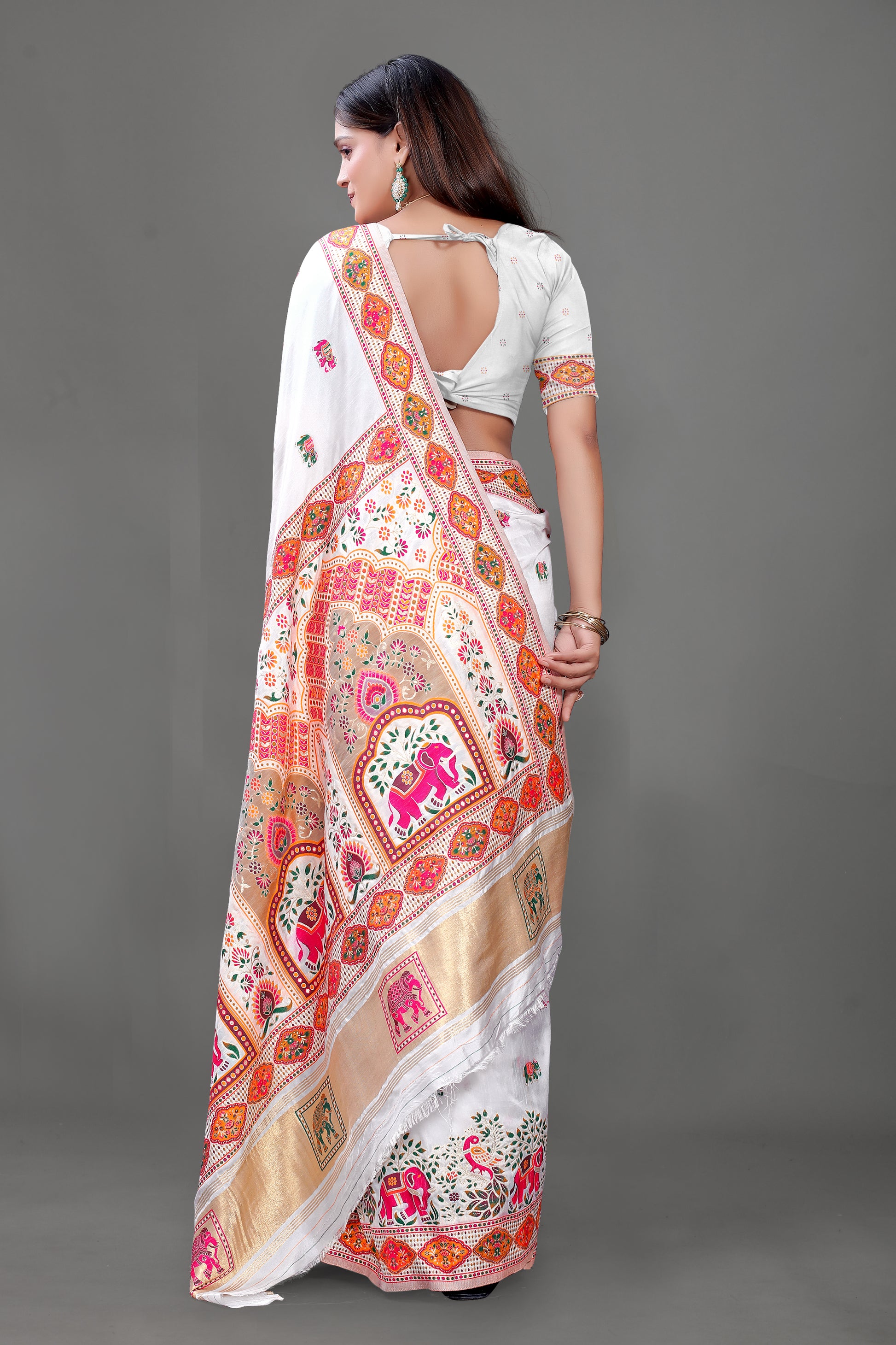 - Type: White Cotton Silk Blend Saree with Rajasthani Elephant Motifs